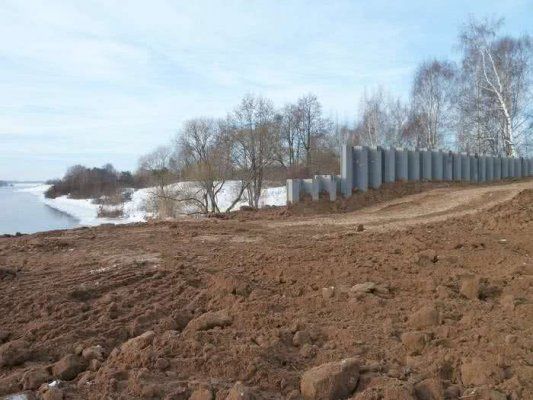 Это сплошной частокол из бетонных свай с частичным перекрытием, армированных через одну. Оптимальный вариант ограждения в черте города, поскольку вибрации при монтаже отсутствуют. Минус – дольше, чем монтаж шпунтовой стенки, поскольку нужно дожидаться созревания бетона:- бурятся скважины с шагом чуть меньше сечения будущей сваи;