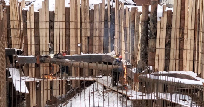 Шпунтовое ограждение котлована из шпунта Ларсена с распорами, выполненное специалистами «АрктикГидроСтрой»